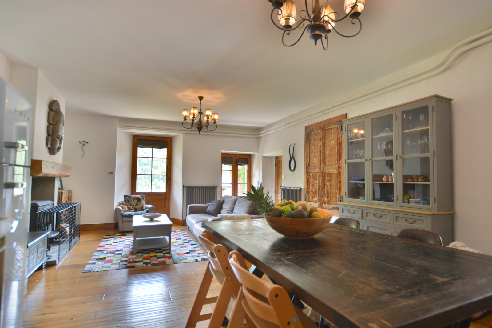 La maison se compose de 8 pièces principales, incluant 3 chambres doubles, une somptueuse suite parentale de 40 m², une cuisine entièrement équipée, un séjour chaleureux avec cheminée, un salon/salle de jeux, une magnifique cave à vin et un bureau. Le jardin de plain-pied, orienté sud et ouest, offre un coin barbecue et une vue imprenable sur les montagnes environnantes, parfait pour profiter de moments de détente en famille ou entre amis.