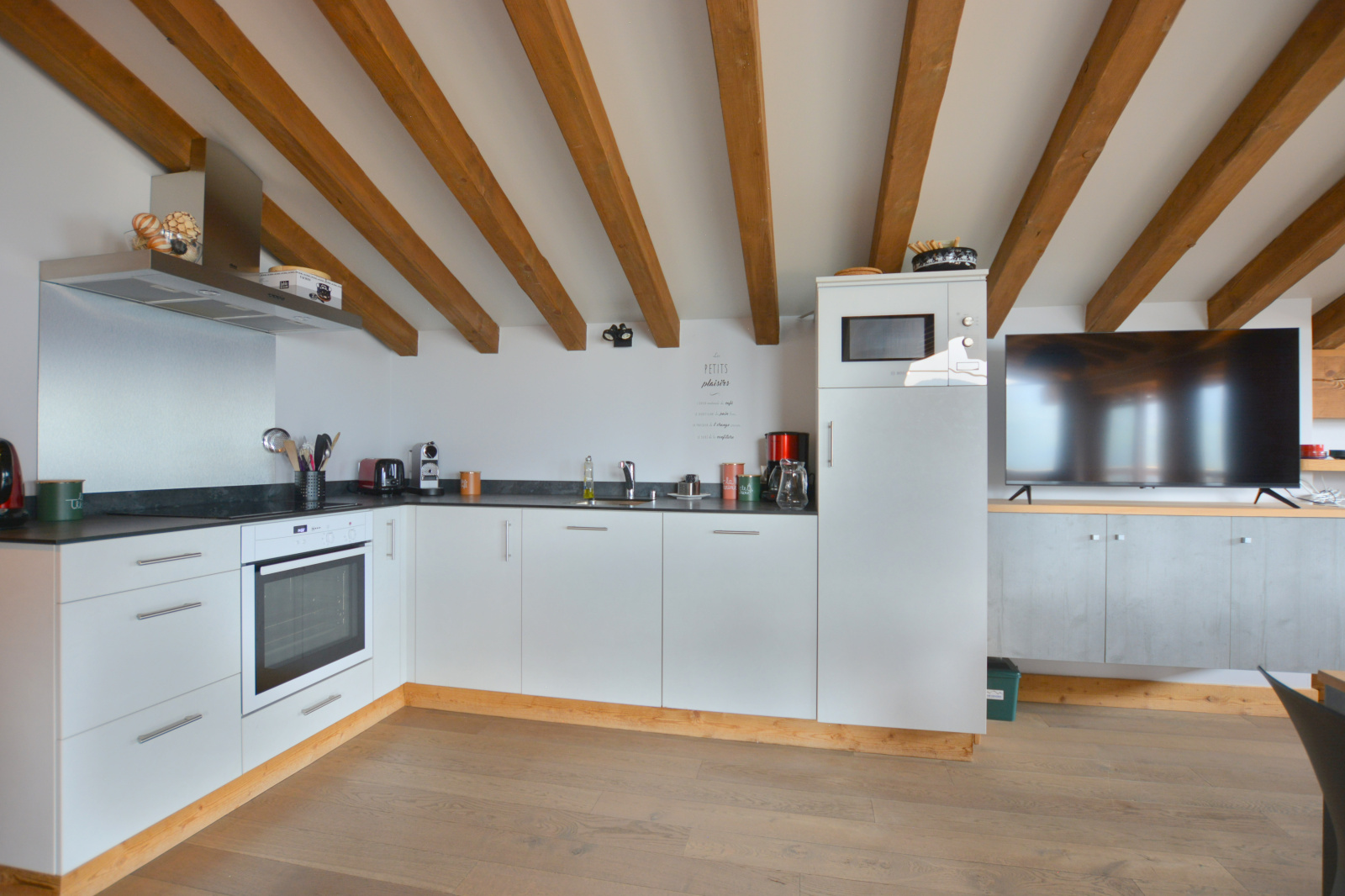 La cuisine, ouverte et entièrement aménagée, complète agréablement l’espace de vie. L’appartement comprend 3 chambres, dont deux dotées d’un balcon, toutes equipées de rangements. La salle d’eau moderne dispose d’une douche à l’italienne et d’une machine à laver. Pour compléter ce bien, l’appartement offre deux places de parking, un garage fermé individuel et une cave d’environ 7 m². Vendu meublé. Prêt à être habité ou loué (les locations de type Airbnb sont interdites).